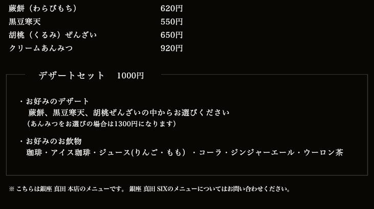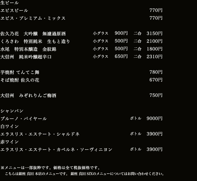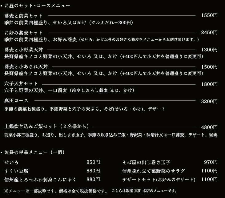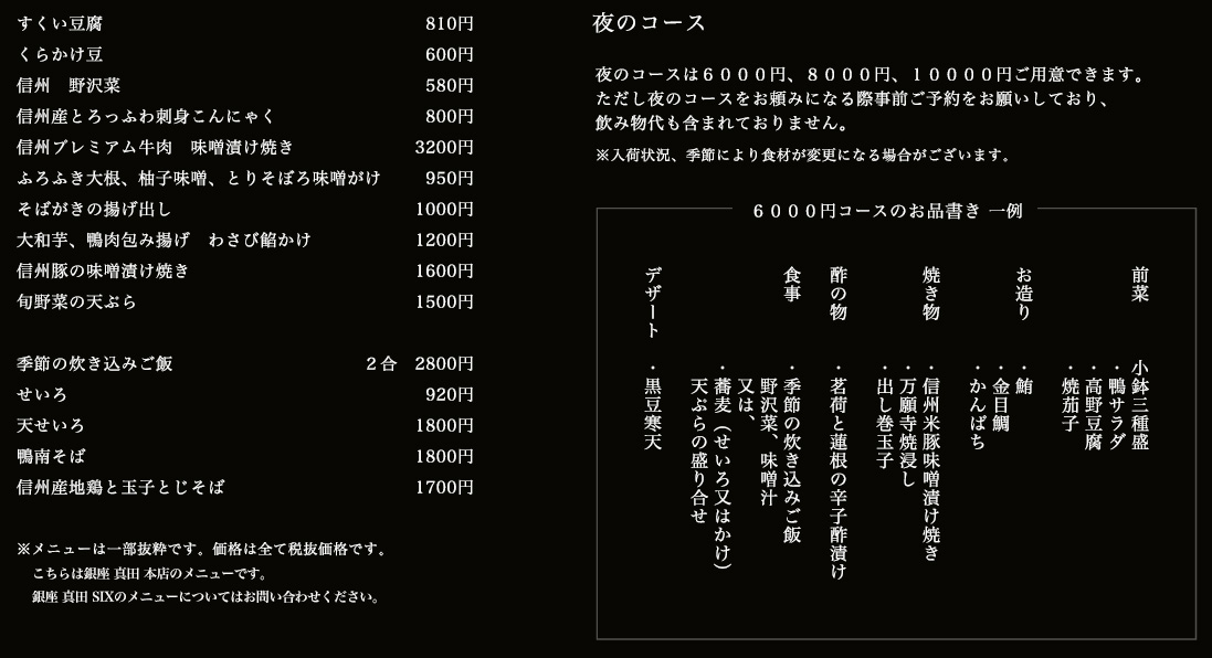 銀座 真田は、信州の契約農家から直送される新鮮な野菜、地元で昔から親しまれている伝統野菜等、隠れた食材を用い食材の味を生かした品々を皆様にご提供して参ります。 信州には多くの優れた酒蔵があり、その中より選りすぐりの酒をご用意し、酒と料理の“調和”をお楽しみ頂きたいと考えています。又、近年、信州ワインは世界的に注目されており、その中からも優れた品を皆様にご提案して参りたいと思っております。真田ではしっかりとお食事されたい時は勿論の事、カウンターで気軽に一献傾けるもよし、飲みの後の締めの蕎麦としてもよし、昼から深夜まで様々なシーンで気軽にご利用頂けるお店となっております。 店内では、長野県を中心に活動する作家の作品を多く目にする事が出来ます。壁に掛けられた絵画、料理が盛り込まれる器等、一つ一つ丁寧に作り込まれた手作りの温もりを感じて頂ければと思います。 林の中の一軒家をイメージして作られた空間で「季節の一品料理」「信州そば」 オーダーを頂いてから土釜で炊き上げる「季節の炊き込みご飯」等、確かな技術を持つ職人が心を込めて調理した品々をお楽しみ下さい。